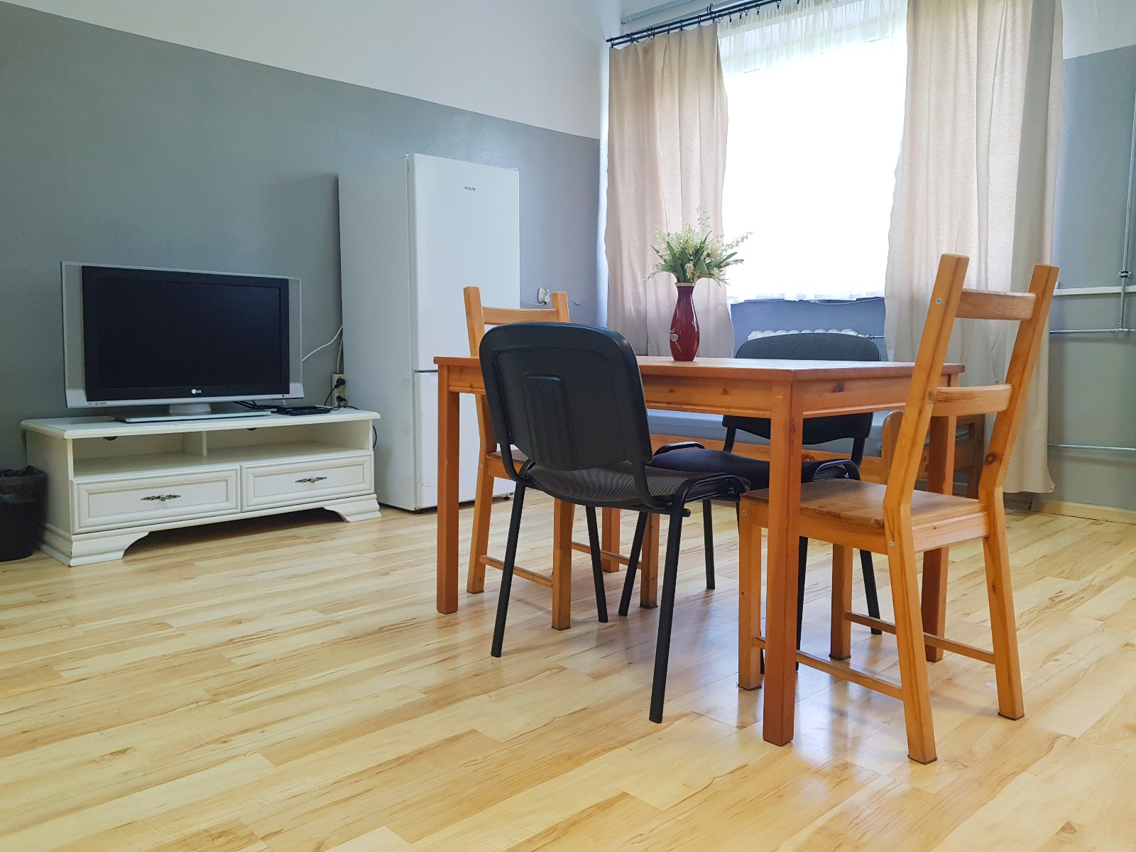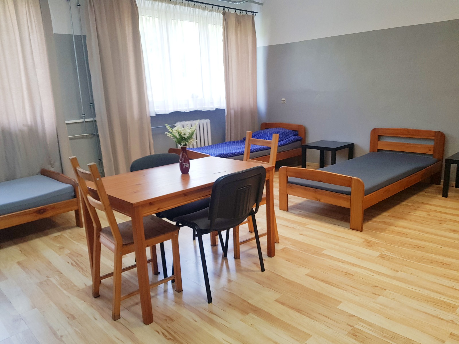 Przestronny i funkcjonalny pokój przeznaczony dla czterech osób, idealny zarówno dla rodzin, jak i grup znajomych. Wnętrze utrzymane w ciepłej, domowej stylistyce, z drewnianymi meblami i jasną podłogą, tworzy przytulną atmosferę sprzyjającą wypoczynkowi. Na wyposażeniu znajdują się cztery pojedyncze łóżka, stoliki nocne, stół z krzesłami, szafa na ubrania oraz telewizor. Duże okna zapewniają naturalne światło i widok na spokojną okolicę, a świeże kwiaty w wazonie dodają wnętrzu przyjemnego akcentu. To doskonały wybór dla Gości, którzy cenią sobie przestrzeń, prostotę i komfortowy nocleg.