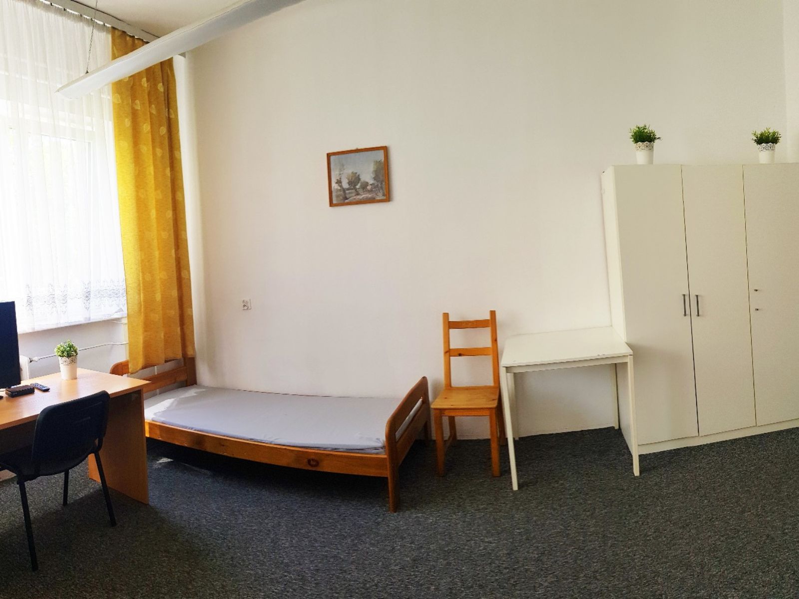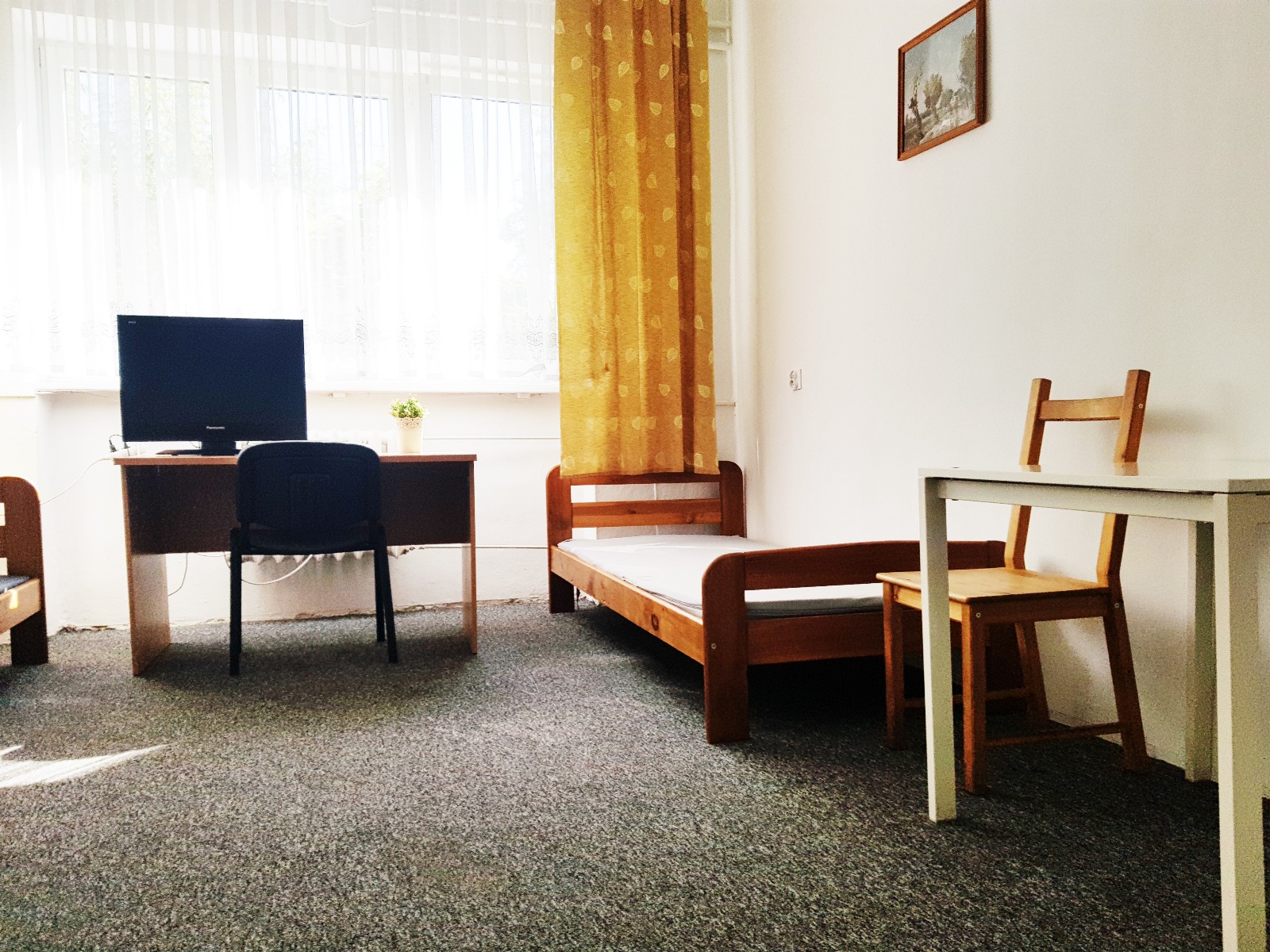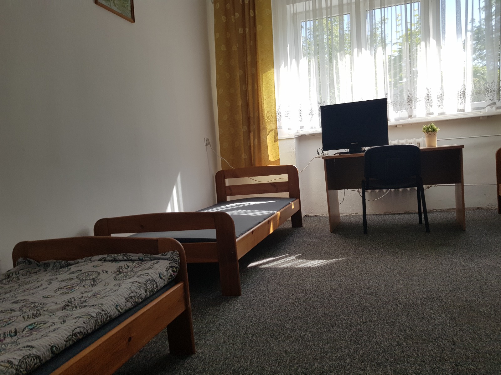 Jasny i przytulny pokój przeznaczony dla trzech osób, idealny dla rodzin, grup znajomych lub osób podróżujących służbowo. Wnętrze utrzymane w stonowanych barwach z żółtymi zasłonami i naturalnym światłem wpadającym przez duże okno tworzy ciepłą, domową atmosferę sprzyjającą relaksowi i odpoczynkowi. W pokoju znajdują się trzy pojedyncze łóżka, szafa, biurko z krzesłem oraz stolik. Dla wygody Gości przygotowano także telewizor oraz niezbędne wyposażenie pozwalające na komfortowy i spokojny pobyt. Pokój zapewnia wygodę, ciszę i stanowi doskonałą bazę wypadową do zwiedzania Lublina lub pobytu w celach zawodowych.